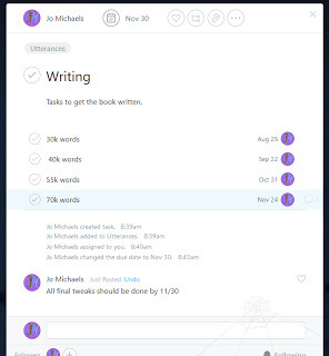 Now, if you're working with other writers or people on a project of any kind, this app reallllly comes in handy. We've used it a ton with the F5 projects we've done. It helped us set due dates for everything from book trailers to marketing to writing and beyond. Each week, it also sends out a project status email that tells everyone in the group what's been done and what's left to do.