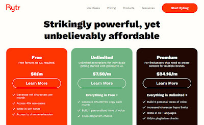 This is the Rytr homepage a little closer to the bottom. I figured you might like to see the pricing before we dive into the writing. Well, you get 10k characters a month free, so we'll try to make the best of it.
