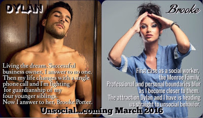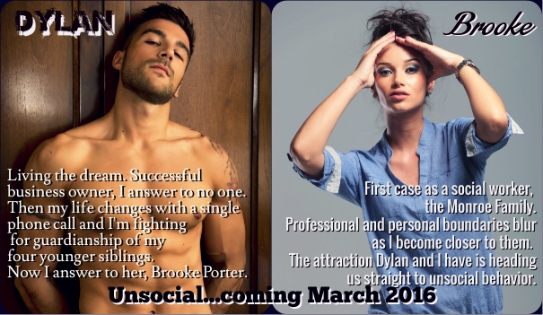 I’ve devoted myself for the past six years to my dream of being a social worker. My very first case are the Monroes, and professional and personal boundaries blur as I become closer to them. Now my dreams are of Dylan. The attraction Dylan and I have is heading us straight to unsocial behavior.