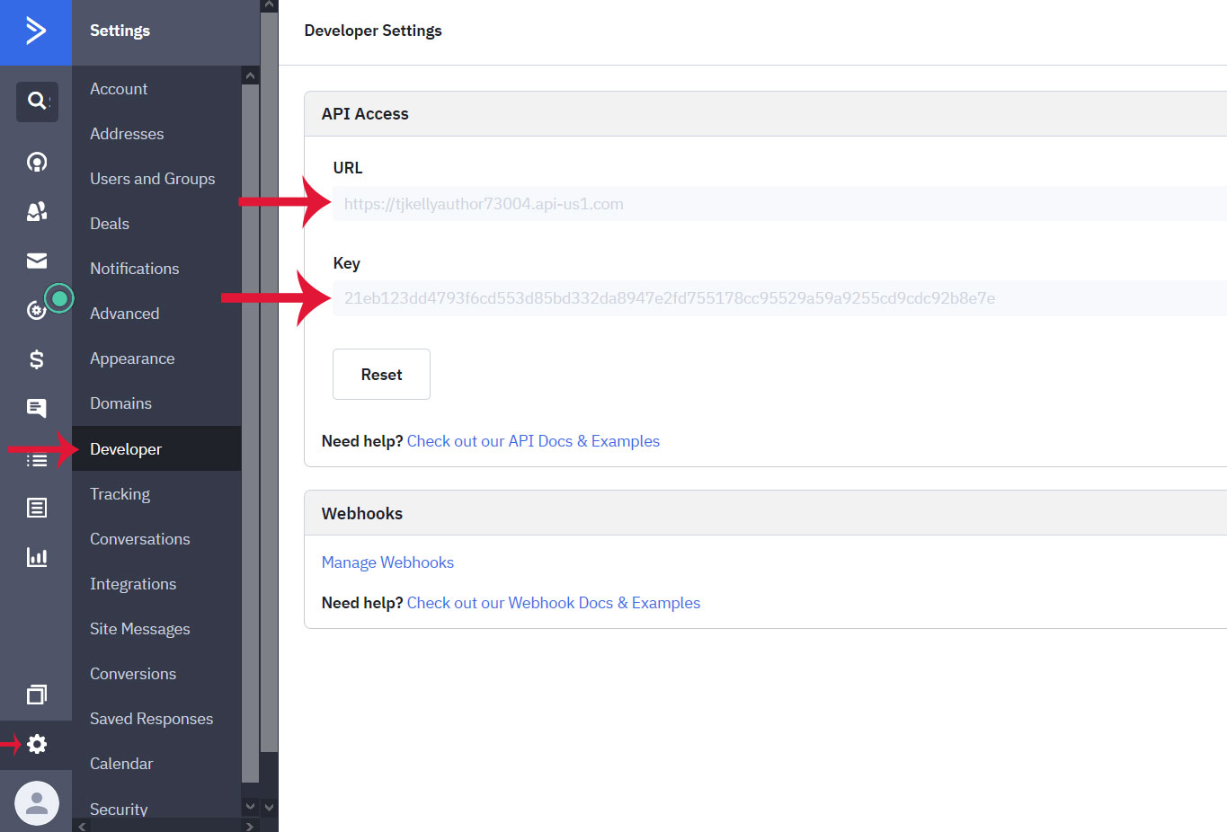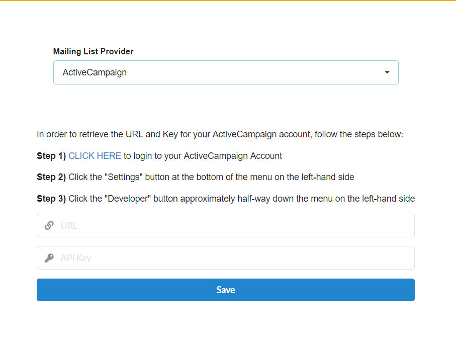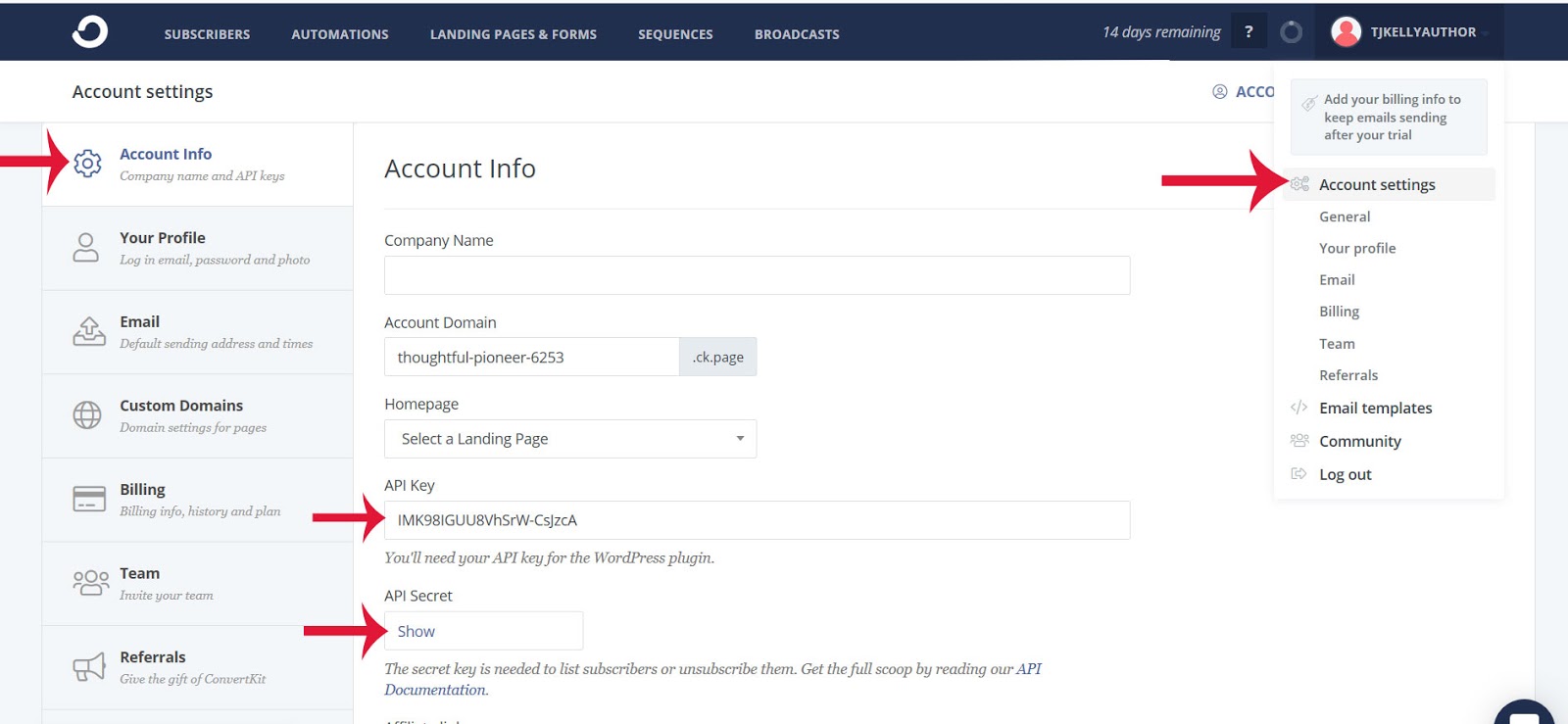 Let's go one higher and click on Integrations. This is where you'll connect your mailing list and a VERY important function of the site.
