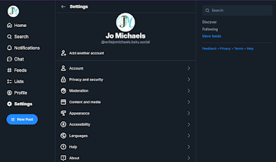Add another account - This allows you to have another handle (username) with a different email address.Account - If you click this one, you can change your password, birthday, etc.Privacy and security - You can enable two-factor authentication (recommended), and prevent users of the app from seeing you when they're logged out. Because it's an open-source platform, other apps may still be able to see your profile. Just click it and do some reading/exploring.Moderation - This option is rather vast, so I suggest checking it out and getting into the nitty gritty, but on a basic level, you can hide nudity (artistic--other nudity isn't allowed), block, or select keywords to unsee.Content and media - Manage saved feeds (more in a minute), allow auto-play for other apps, and get down in the nuts and bolts of your follow feed. This app lets you create your own experience, so learning how to use all these things can only help you.Appearance - Choose your color mode, size of the text (yay!), theme (dark/light), and font here.Accessibility - Alt texts requirements. This is for folks who use a reading app for sites. It tells them what the image is as a descriptor.Languages - You can choose from a bajillion languages for your feed, the app, and your content.When you click your profile from the menu on the left: