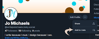 Last, but certainly not least, you can make yourself Lists. This is a throwback from Twitter, and I had a ton of lists there so I could only see the people I wanted to see. To add someone to a list, first create a new list by clicking Lists on the menu on the left, then click the three dots on the person's profile page who you'd like to add, select add to Lists, and then choose which list you'd like them on.