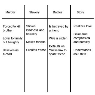 Temujin begins life believing he's the end-all be-all and has very astute ideals about how things should be. When he breaks his values during the story, he ends up with a lot of humility and understanding about life and love. This can be ramped up with a little bit of tweaking, but it'll give you a map to work from. I didn't show what I have in store for the women of WSTW because that would spoil the last book.