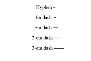 Hyphens, en dashes, and em dashes are the most commonly used.