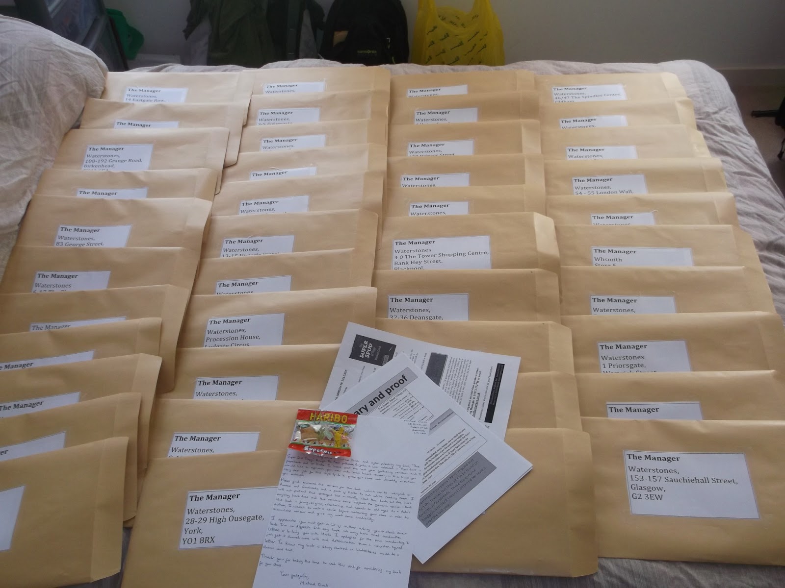 For the last six weeks at work I was busy working on a little operation to try and get Waterstones to stock my book. I selected 42 Waterstones stores, one for each day of my work hitch and once a day I handwrote an A4 size letter to the manager of that store. I included the press release, a summary of my reviews and a little bag of Haribo to try and bribe the manager. I'll be posting them out tomorrow, probably at a ridiculous sum postage cost and crossing my fingers that at least one Waterstones will like my letter and agree to stock The Super Spud Trilogy. And if not one of them does, well I guess I'll choose 42 different stores for my next hitch!