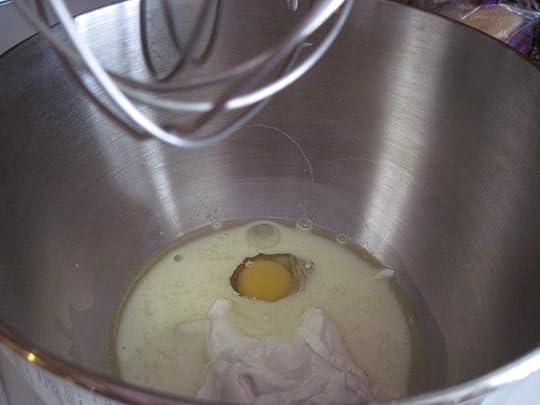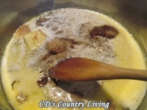 Add the sugar, salt and half and half-and begin whisking! (Funny looking whisk I know-but after this picture I did switch out the spoon for one!)