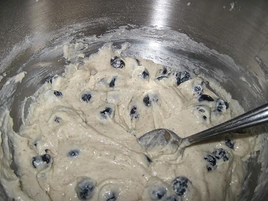 Slowly mix dry ingredients with wet. Fold in blueberries.