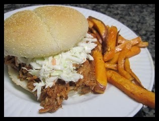 For a side dish, I made up a batch of sweet potato fries. Perfect compliment to the spicy barbecue and tangy coleslaw!!