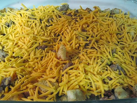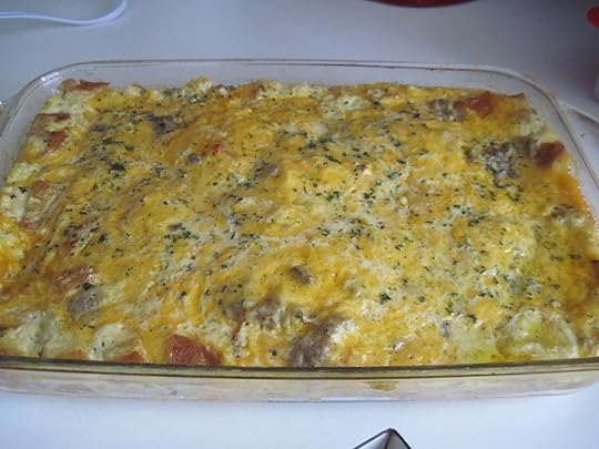 See! How easy was that? Now all I have to do tomorrow is- Preheat my oven to 325 and bake the casserole for 1 hour and 15 minutes. Than remove foil and bake for 15 minutes more.This cheesy egg dish will pair well with my blueberry muffins, and fruit parfaits!