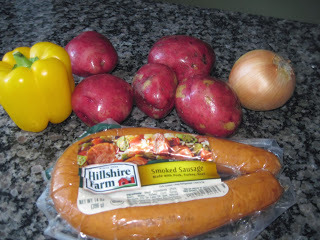 I love Pinterest! I know- who doesn't? But, I really, really love it. I can find ABSOLUTELY everything on that site-including what is for dinner tonight. I've had a package of sausage sitting in the fridge for a couple of weeks now, and I figured it was time to use it up. So, I did a quick search on Pinterest, and guess what I found? You got it-a simple, yet delicious meal!