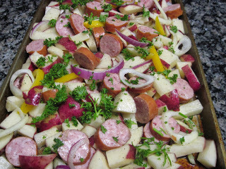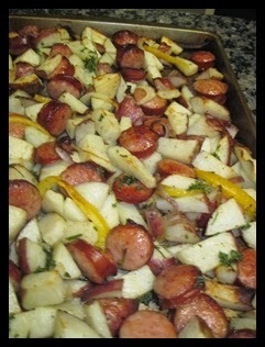 Preheat oven to 400. Spray baking sheet with cooking spray. Dice potatoes into 1/2" chunks. Slice sausage into 1/5" chunks (recipe called for 'bias cut'-I didn't have a clue what that was, so I just cut them somewhat thin). Cut onion and pepper into strips. Place all ingredients onto baking sheet and pour 3 TBLS of olive oil over top. Mix with fingers until well coated. Add 1 tsp salt. 1 tsp ground pepper. (I also added 1 tsp garlic powder, because my husband loves the taste of garlic-and the meat wasn't flavored.)