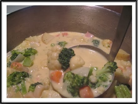 In a separate (large) saucepan-combine cream of potato soup, water, milk, celery,onion and ham. Simmer on low (stirring frequently) until other vegetables are done. Add (drained) vegetables. Add cheese and stir until melted.