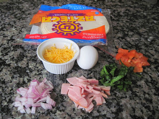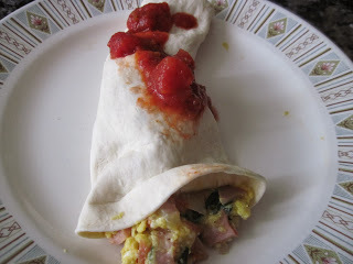 Heat skillet with 1 TBLS. of olive oil. Add onion, ham, tomatoes and spinach in the skillet and cook until the spinach begins to wilt and the ham is heated through. Place 8 inch tortilla between two paper towels and microwave for 20 sec. Beat egg with a tbls of skim milk and add to mixture, stirring constantly. Add cheese. When cheese has melted, remove from heat and place in center of warmed tortilla. Wrap and serve with salsa.