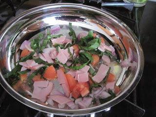 To save time, I cut up the ham, red onion, tomatoes, and spinach the night before.