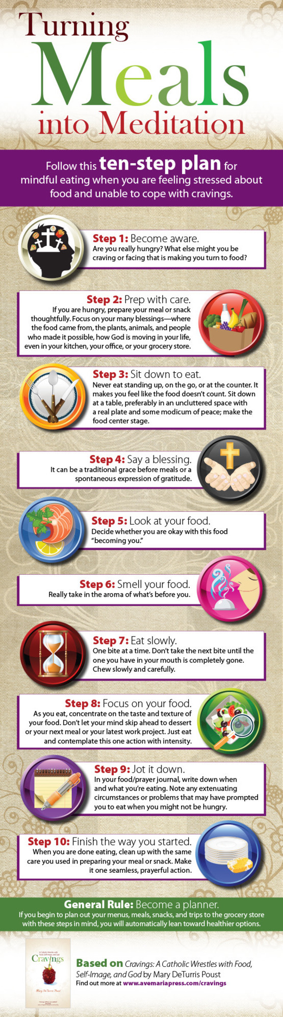 Today I’ve got the perfect little bonus for those of you looking to use this time of Lenten reflection to get a better handle on your meals and your mindfulness. Ave Maria Press has created the beautiful bookmark you see on the right, giving you the Cliff Note’s version of how to transform meals into meditations. Keep it in your favorite book, or, even better, post in on the fridge where it’s more likely to hit you at the exact right time. Leave one in your car or at your desk if you tend to eat on the go or while you work.