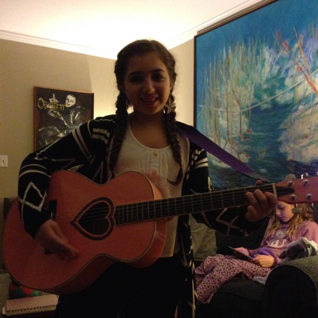 Meanwhile back at home…Olivia took out the garage-sale guitar we picked up for her a few years ago and decided to give it a try. So I tuned it up and showed her a few chords. I love this photo of Olivia playing and Chiara in the background in our living room. I have to admit that this photo of Olivia reminds me of myself when I was her age and played guitar day and night. Makes me smile:
