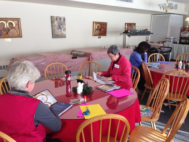 GPS: I was blessed to be the leader/speaker of the 22nd annual Christian Mothers’ Retreat at Christ the King Retreat House in Syracuse this weekend. Our topic was my favorite: “Broken, Beautiful, and Beloved: Learning to See Ourselves through God’s Eyes,” and, as always, I got more than I gave. At least from my perspective. What a wonderful group of women and so inspiring. They started this retreat on their own 22 years ago with no parish or diocesan or organizing group as a sponsor. Just a bunch of moms who wanted spiritual nourishment and community. They are like one big family — godparents to each other’s children, best friends, encouragers, supporters,  listeners, pray-ers. We talked about our brokenness and our belovedness and how to fit prayer into our very busy lives. And we made collages, my new favorite activity. Here are some of the ladies at work in the dining room.