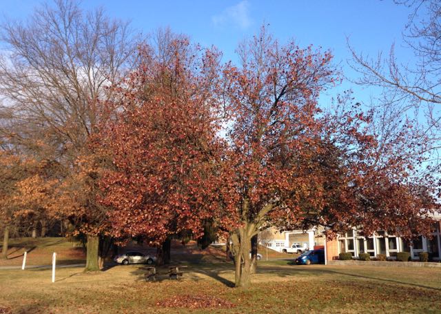 When I was on silent retreat last month, I sat in the dining room on our final morning, staring out the window at the peaceful, frozen landscape. In the front yard of the Dominican Retreat and Conference Center in Niskayuna (yes, this place is becoming a perennial favorite in my posts) amid the many barren trees and evergreens was one lone tree still covered entirely in leaves — dead, brown leaves hanging ever-so-delicately yet ever-so-resiliently from its sprawling limbs.