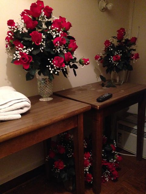 to call on St. Therese, hoping for a sign but not expecting one. I got to my retreat house room, put my bags down and looked for someplace to hang my clothes. I slowly opened the only door that could be a closet in the beautiful old room with a fireplace and enormous old-fashioned bathtub. I was worried I might be going somewhere I shouldn’t, like another person’s room. As the door swung open I could see hangers and stepped in all the way, and when I did, I was floored. There to my left, in what amounted to a big storage closet, were four giant vases filled with red roses. Velvet ones, mind you, but roses nonetheless. I have to say, she got my attention and I will not be so quick to ignore her in the future. To top it off, the next morning, when I told two of the women sitting in the conference room about the experience, one woman pointed to the wall behind where I was sitting, and there was a picture of St. Therese. Okay, I got it. You’re listening. I may have to go back and re-read her Story of a Soul.