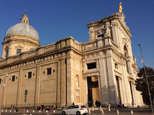 Our first day in Assisi also included a visit outside the city walls to St. Mary of the Angels, which is the basilica that is built over the Porziuncula. So it is a church within a church. Here’s the basilica from the outside:
