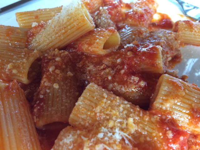 Believe it or not, this alley and that shrine are on a regular street where we found an amazing little restaurant, Otello’s. We had a fantastic meal, and our guide later told us — when she asked where we had eaten — that we had found a local gem. We can vouch for that. Here’s my meal of farro e fagioli. Dennis’ pizza is in the background. And local wine, always wine.