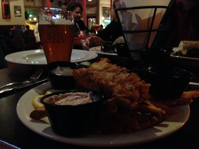 mid-afternoon, well past lunch and way too early for happy hour. We sat at the bar, and our knowledgeable and friendly bartender Steve guided us through the extensive craft beer menu. Most of the beers are brewed in the region, with a few from some far-flung places, and the menu changes daily. On top of being really good, the beer is really cheap and every pint comes with a free personal pizza. Not kidding. Dennis and I weren’t planning on eating lunch, but how do you pass up free pizza? Best part is that you take your free pizza ticket directly to the kitchen and hand it to the cook. Then you go back later and pick up your own pizza. Very cool. The pizza was super thin and crisp — reminded me of pizza I’d had in Rome — and delicious. But I digress. Back to the beer.