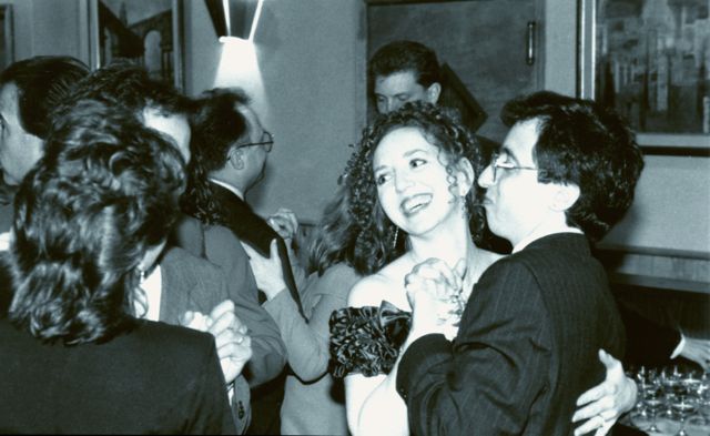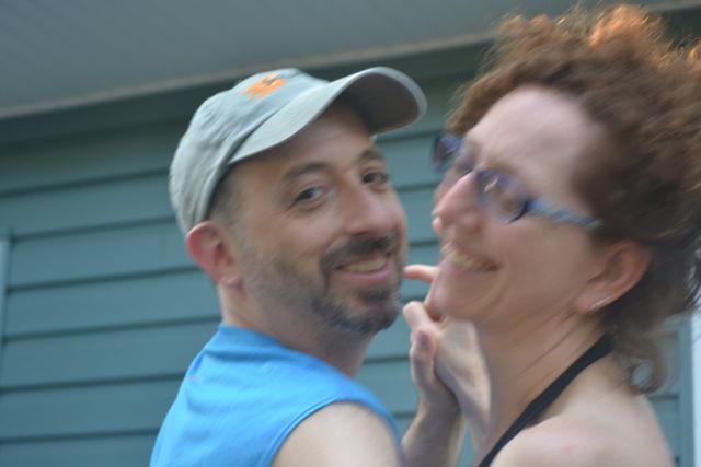Although I love that traditional wedding photo of us over there on the right, I also have to post two other photos. One is my favorite candid shot of us from our wedding, the black and white photo Maria took when we were dancing and talking to Tricia. The other is another dance shot, from just last summer, when Olivia snapped us as we were dancing on our deck after an afternoon at the pool. Same happy faces, same sort of pose, just 19 years apart.