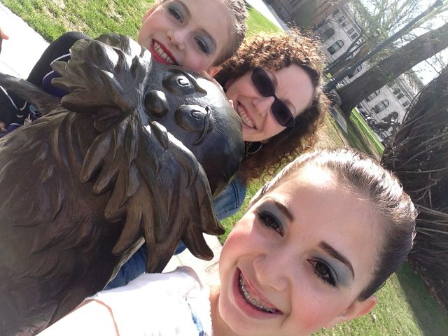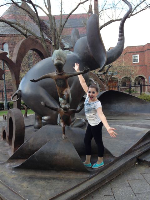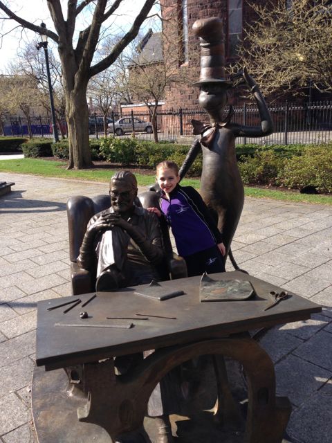 Viewfinder: With two dance competitions back-to-back, the girls and I had lots of together time, and lots of fun. Especially this past weekend, which we spent in Springfield, Mass. (Previous weekend was in Gloversville, N.Y. I wouldn’t recommend it as a travel destination.) But Springfield was a nice little getaway, only 90 minutes from home and with things to do and good places to eat. We were based at the Marriott, which was a great location for our competition, as well as our visit to the Dr. Seuss National Memorial Sculpture Garden. Here I am with the girls hamming it up with our Seuss favorites. Please excuse the bright blue eye shadow — competition dance requirement. (You can also see Chiara and fellow dancers stretching before their final dance in that Degas-like photo above.)