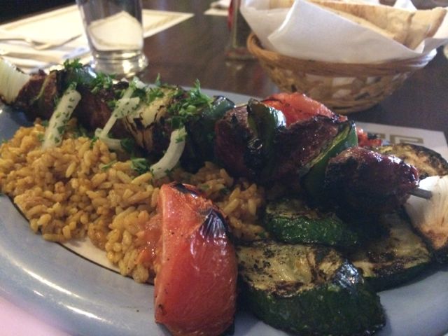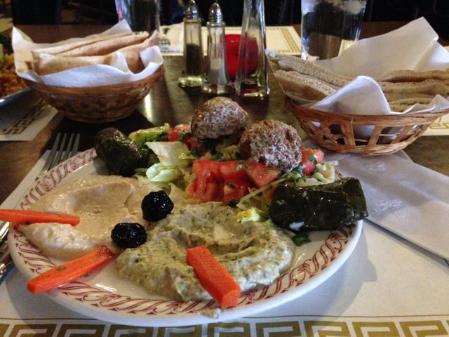 The food here is absolutely fantastic, and you really can’t help tapping your feet to the Middle Eastern beat of the music. I only order one thing at Mamoun’s: Vegetarian Combo Platter. So, so, SO delicious. Falafel, stuffed grape leaves, hummus and warm pita bread, baba ganoush, olives. You can get a look at it over there on the right. Dennis opted for the lamb kabob and was equally satisfied.