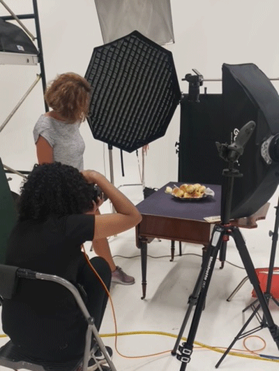 Photographer Jennifer Arce and food stylist Kimberly Tabor create a shot for the Classic Dinner Rolls recipe, trying out different backgrounds and props. Seeing the completed dinner rolls helped me describe the appearance of the rolls.