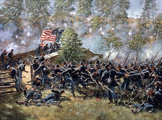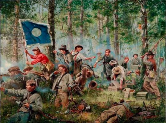 These troops are firing at my great-great grandfather, George Immel of the 92nd Ohio Volunteer Infantry, located a few hundred yards in their front. They missed! (Luckily for me. Perhaps due to the rude log breastworks that the Union troops had erected in the night. They also missed at Missionary Ridge, the entire Atlanta Campaign, the March to the Sea, and the Carolinas campaign. George returned home to sire eight children.)