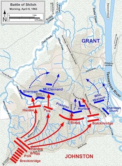 In sum, I think that the controversy over the Confederate battle plan at Shiloh is a red herring. The evidence that Johnston seriously considered an alternative is wafer-thin: and if he did consider it, he obviously was not strongly committed to it, else he would not have deferred to Beauregard. More importantly, the feasibility of the plan is highly doubtful, given the reality that the Confederates had to approach the Union camps over a single road and there were no easy ways to deploy from a column of corps on that road into a line of corps abreast. And perhaps most importantly, the friction of battle and the reality of no-plan-survives-contact-with-the-enemy meant that regardless of how they were lined up to begin with, the Confederate brigades would have almost certainly operated largely independently as dictated by the terrain and the deployment of Union troops.