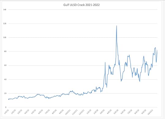 Gulf Diesel-WTI CrackAlthough the crack was gradually increasing in 2021 (due to the rebound from COVID lockdowns) the spike up corresponds almost precisely with the Russian invasion. After reaching nosebleed levels in late-April, early-May, the crack declined to a still-historically high level and roughly plateaued over the summer, before beginning to widen again in September. This widening is in large part a seasonal phenomenon–heating oil (another middle distillate) demand picks up at that time.