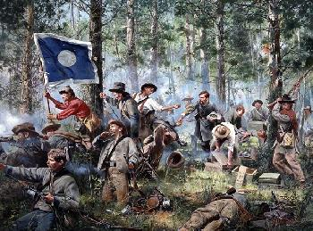 This is a Don Troiani print of Cleburne’s Confederate division fighting at Chickamauga. In the print, Cleburne is passing out ammunition to shoot at my GGGF, because Cleburne’s division was attacking the 92nd’s position: