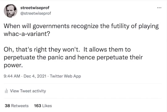 It’s all about control, in other words. And if you have been paying attention–hell, if you’ve been sentient–for the past two years you will realize that the push to control you is omnipresent. COVID–or more exactly, the responses to COVID–should give you all the evidence that you need. Most policies, whether it be lockdowns, or masks, or mandated “vaccinations” of dubious efficacy and largely unknown risk profiles, or vaccine passports, and on and on and on, make little if any sense as health measures: at the very least they are not backed by evidence that even remotely matches the fervor with which they are imposed and advocated.