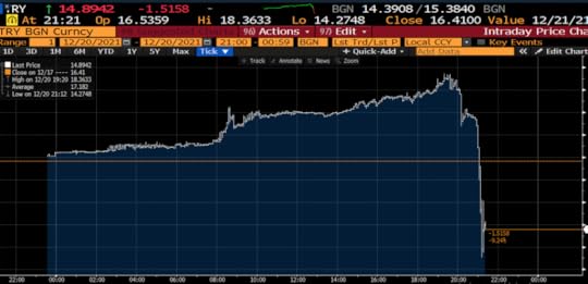 The Turkish lira is now about 12, a big recovery from its nadir on Monday. I expressed skepticism that Erdoğan’s announced policy of guaranteeing some Turkish bank deposits against an adverse move in the TRY was the cause. As we’ll see in a moment there is something to that. But even if the policy announcement caused all or some of the rebound, my skepticism about the viability of this mechanism remains.