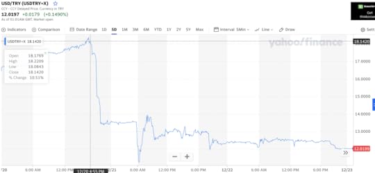 The Turkish Lira has crashed, down over 50 percent since September, and now trading at less than a third of the value it had when I was in Turkey in 2018. It would be unfair to apply Jefferson Davis’ epitaph for the Confederacy: “Died of a Theory.” Instead, “Murdered by a Theory” would be more accurate.