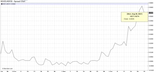 Backwardation on COMEX copper has also jumped recently. Here’s the October 21-January 22 spread(HGV1-HGF2).