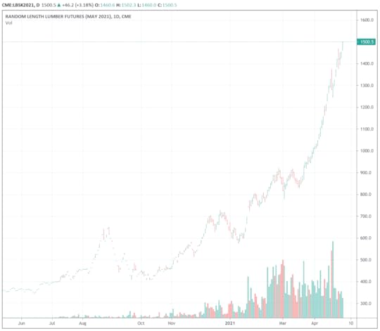 Lumber prices have been on a tear recently. The CME lumber futures price has risen inexorably for weeks: