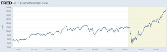 A transportation bottleneck is exacerbating the problems. Shortages of railcars and trucks are limiting the ability of sawmills to satisfy demand. These shortages reflect in part a commodities boom generally. Chinese demand for US ag products (which has sent corn prices soaring) is contributing to that, but the transportation sector has been robust generally since its doldrums of a year ago. In that time the Dow Jones Transportation Average is up 128 percent off its Covid bottom, and is 40 percent above its pre-Covid collapse level.