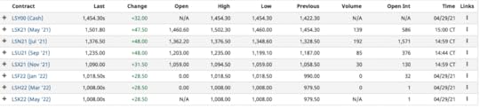 Note there’s an almost 30 percent backwardation going out six months. That’s very steep. Very Although I wouldn’t put too much weight in the distant deferred prices (given the absence of volume and open interest) one, it appears that the curve flattens out after the six month point.