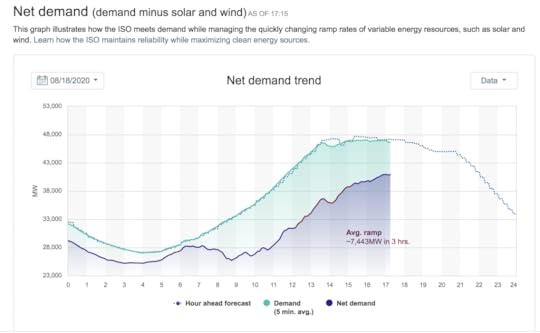 Notionally, the loss in nuclear and conventional capacity has been roughly matched by the increase in solar capacity. But again–that solar capacity is not available under conditions like the state has experienced over recent days, with hot weather contributing to high and rising demand in the late afternoon when solar output is declining. That is, these forms of capacity are very imperfect substitutes. They are most imperfect in the afternoons on very hot days. Like the last week.