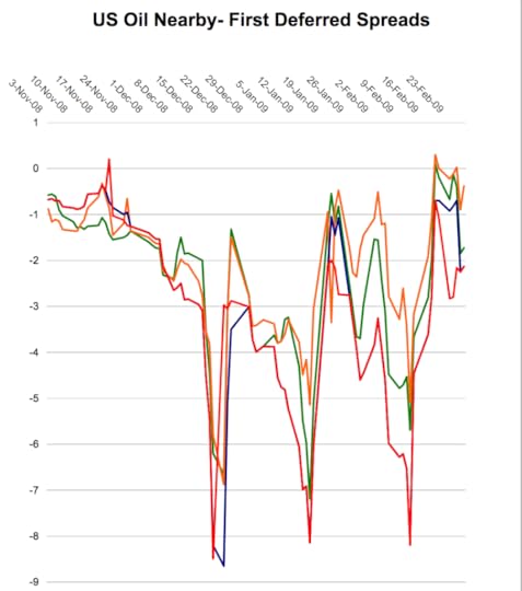 The big downward spikes in the front month-back month spreads correspond with the days around expiry.