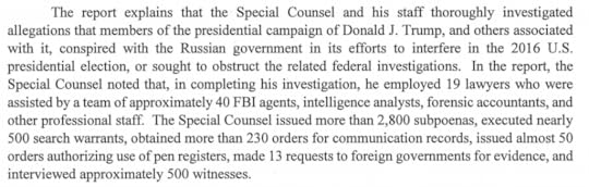 The “leadership” of the FBI that started the whole counterintelligence operation against the Trump campaign, and once it was elected, continued it against the Trump administration, starting with James Comey. These were the people who were interfering with US elections.Key figures in the Obama administration, notably Brennan, Clapper, and Rice . . . and then following wherever that leads.The Hillary Clinton, and the Hillary Clinton campaign and its beard, the DNC, which concocted the Russia conspiracy hoax first as a campaign dirty trick, then continued it as an excuse for its loss and as a means of crippling the administration of the man who had the temerity to derail her coronation.Hillary’s henchmen, especially the loathsome, beyond execrable Glenn Simpson and his tool, Christopher Steele. (One thing I would really like to know is what the Mueller report says about the farcical dossier.)Last, but surely not least, the entire media establishment, not just in the US (the usual suspects, CNN, MSNBC, NYT, WaPo and on and on) but their foreign fellow travelers (esp. the FT, the BBC, and other supposedly reputable UK outlets).