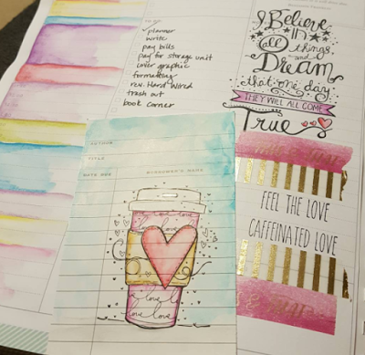 Library cards and coffee paired up with my new watercolors...yep, this page makes me happy.