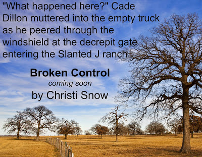 I'm running a little late this morning, but I wanted to share the first line of my upcoming erotic romance, Broken Control. Yes, you read that right...erotic romance. What's a book about ranching without some BDSM roping?? (ahem...I guess that would be the Martin ranch series...LOL. I may have to talk to Matthew about that. ;) Just kidding.)