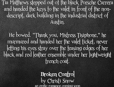 Tia Matthews is the heroine in the story. She's one seriously tough girl. Three years ago, her entire family died in a plane crash, leaving her alone to run the family ranch. That's a lot of stress and pressure on her, so she's learned to channel those emotions through Mistress Tisiphone, her secret persona as a Domme for hire in an Austin BDSM club. In the good old boy ranching world of Texas, they have a hard time dealing with Tia, but if they found out about Mistress Tisiphone, they'd drive her out of business. These are the first lines about Tia in Broken Control...the start of Chapter 1.