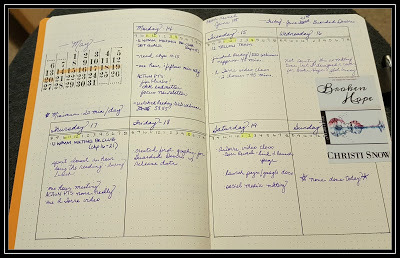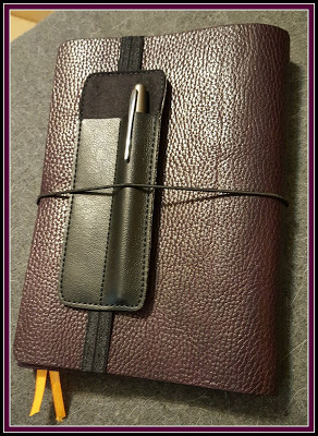 The brown one in the center is my plotting book where I take notes for plotting upcoming books. It's one of the larger goalbooks and is in a Chic Sparrow trifold cover (Note...CS only makes the trifold available a couple of times a year...this one is Pemberley Aubergine). I like this cover for this single book because it wraps around, protecting the notebook, and takes up very little space (it conforms to the single book making it very slim).