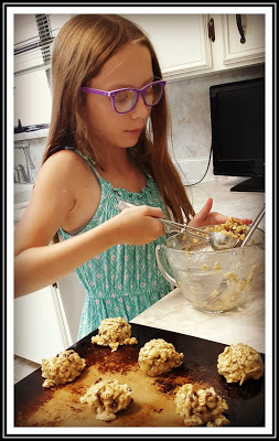 Ingredients:2 ripe bananas (smooshed)1 cup of uncooked oatmeal2Tbsps of mini choc chips.