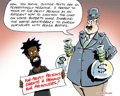 Muhammad Rasheed - It's only "a ridiculous way of looking at it" if your position is to protect white supremacist interests. The diabolical mass incarceration industry feeds upon the artificial criminalization of Black men to enrich the white racist aristocracy. The for-profit prison system is well documented as a continuation of chattel slavery by convict leasing, taking advantage of the 13th Amendment loophole, "...except as a punishment for crime whereof the party shall have been duly convicted."